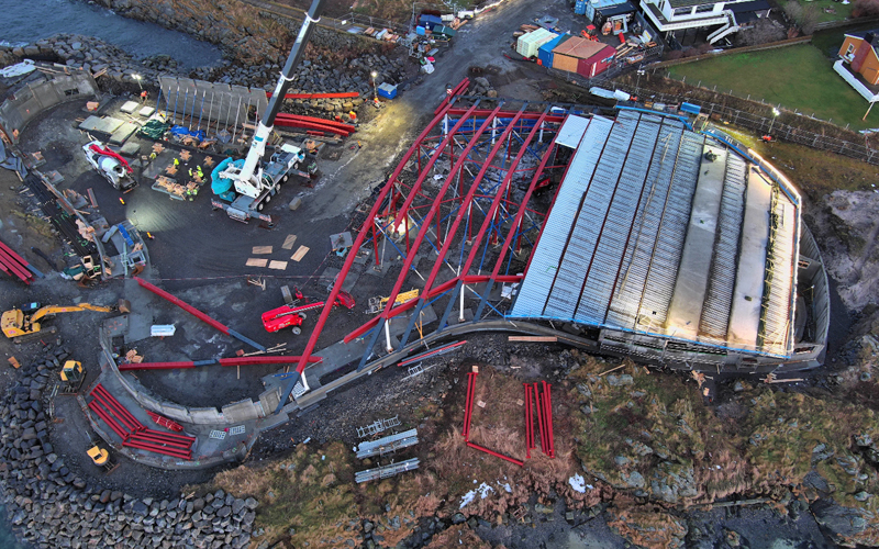 Deler av taket til The Whale er nå kommet på plass og arbeidet går fint fremover. Taket er helt spesielt, som senteret ellers, og her snakker man om 450 tonn ståldragere som skal på plass.