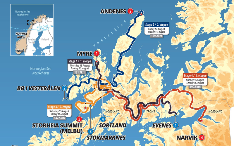 Første etappe blir altså torsdag 13. august fra Evenes til Myre (181,7 km).