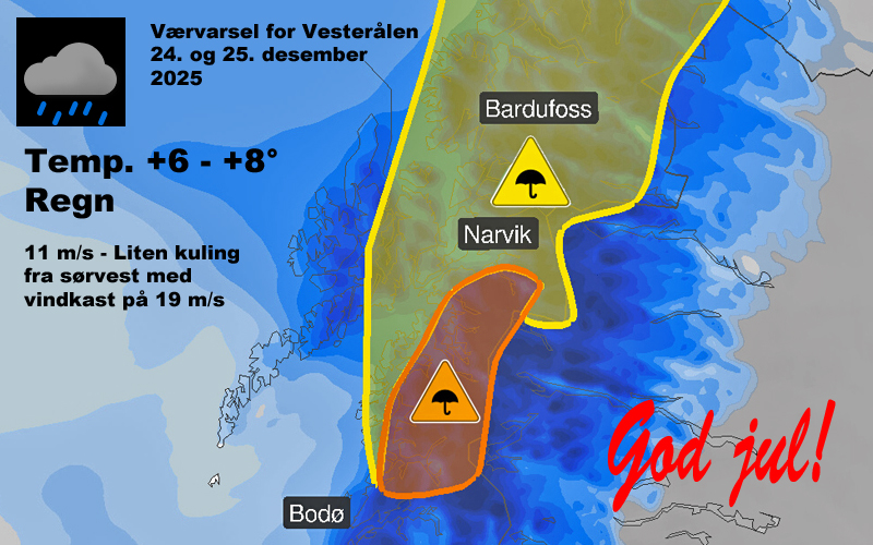 Årets julevær tegner til å bli både vått, varmt og vindfullt i år. Det ventes sørvestlig kuling på julaften og første juledag, som har med seg varm luft og mye regn inn over Vesterålen.